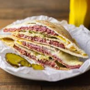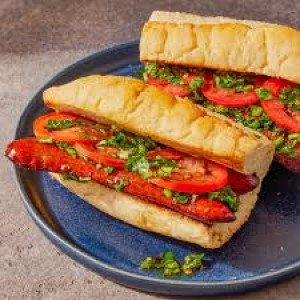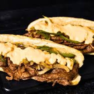 Baguette, steak, cheddar, oignon rouge, sauce barbecue