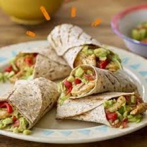 Tortilla, poulet épicé, avocat, tomate, crème fraîche